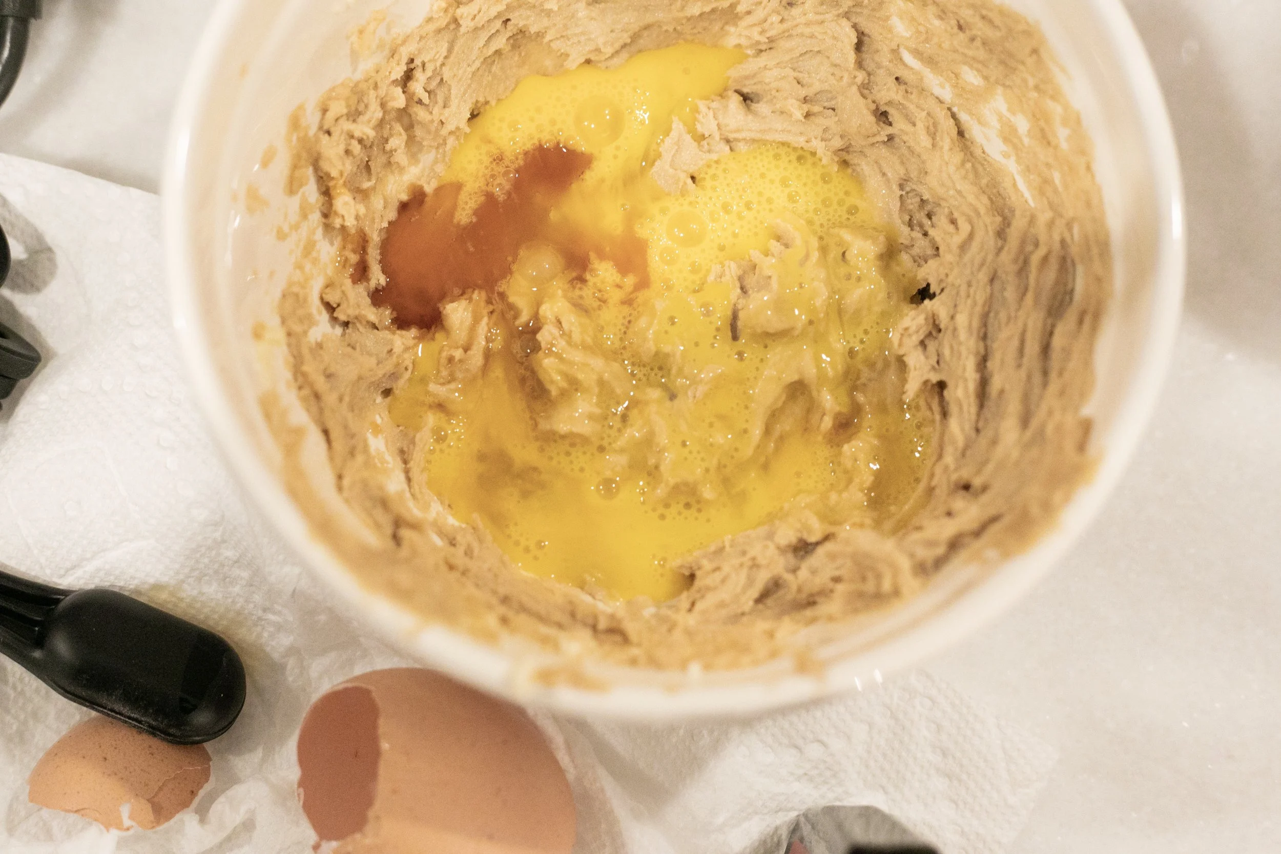Step 4. Add in beaten egg (provided by The Mundorf Family farm Sunday's Well @bitmore ) and vanilla extract, blend together on a low setting